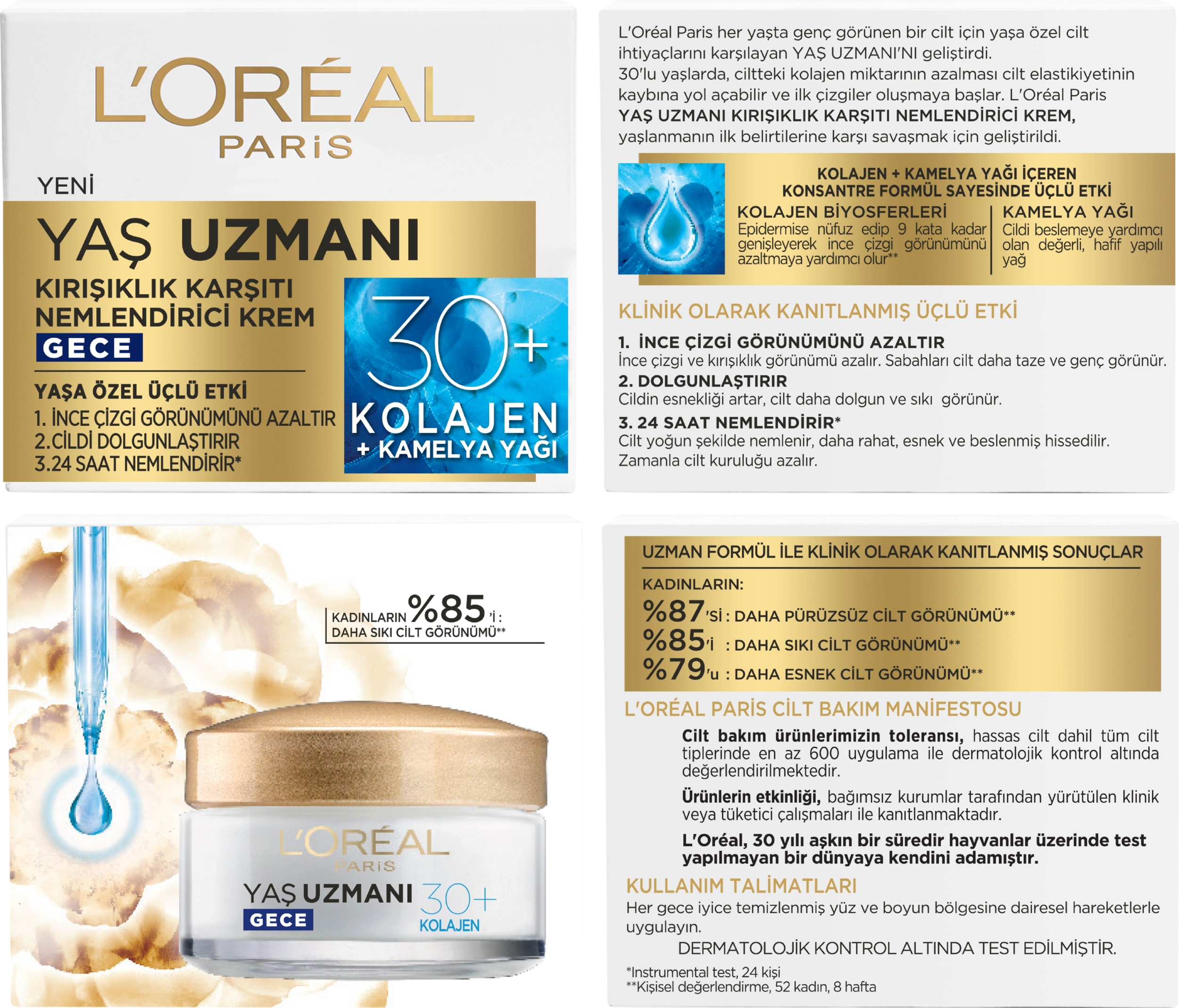 L'Oréal Paris'in yaşlanma karşıtı serisinin önemli bir parçası olan Yaş Uzmanı 30+ Kırışıklık Karşıtı Nemlendirici Gece Kremi cilt bakımında yeni bir dönemi temsil eder Bu krem özellikle 30 yaş ve üzeri kullanıcılar düşünülerek formüle edilmiştir ve cildin nem dengesini korumayı amaçlar Ürün nemlendirici etkisi ile öne çıkar ve gece boyunca cildin yenilenmesine katkı sağlar